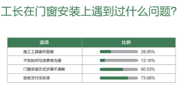 但是,在行业迅速发展,产品质量日渐提升的同时,门窗安装服务因高度依赖人工完成,无法统一标准,导致了作业水平层次不齐,安装不到位,给消费者带来了不好的服务体验。有调查显示,52%的消费者在门窗使用过程中遇到过漏风漏雨、门窗变形等问题。
