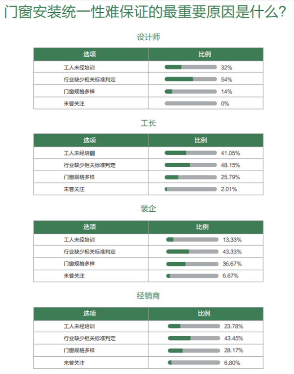 从设计师到工长、装企、经销商,都认为门窗安装统一性难保证,首要原因是“行业缺乏相关标准判定”,其次才是“工人未经培训”、“门窗规格多样”。同时,参与调研者非常认同门窗安装标准化、流程化带来的积极影响,希望通过科学培训,严格规范,解决因安装不当带来的安全隐患,保护工人施工安全;通过规范作业,提升门窗隔音隔热等性能实现,延长门窗使用寿命,提高门窗颜值。