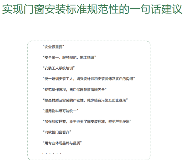 针对如何实现门窗安装标准规范性,关键词top4是“安全”、“培训”、“统一”、“专业”。如从流程规范角度出发的“服务规范”“培训安装工人”“规范化操作流程”;从材质角度出发希望统一安装物料,提高材质严密性;从沟通角度,希望业主也可以同步了解安装流程,从而减少矛盾;众多参与调研者希望,其他门窗企业可以和欧哲一起,推动门窗行业安装交付规范化、标准化。
