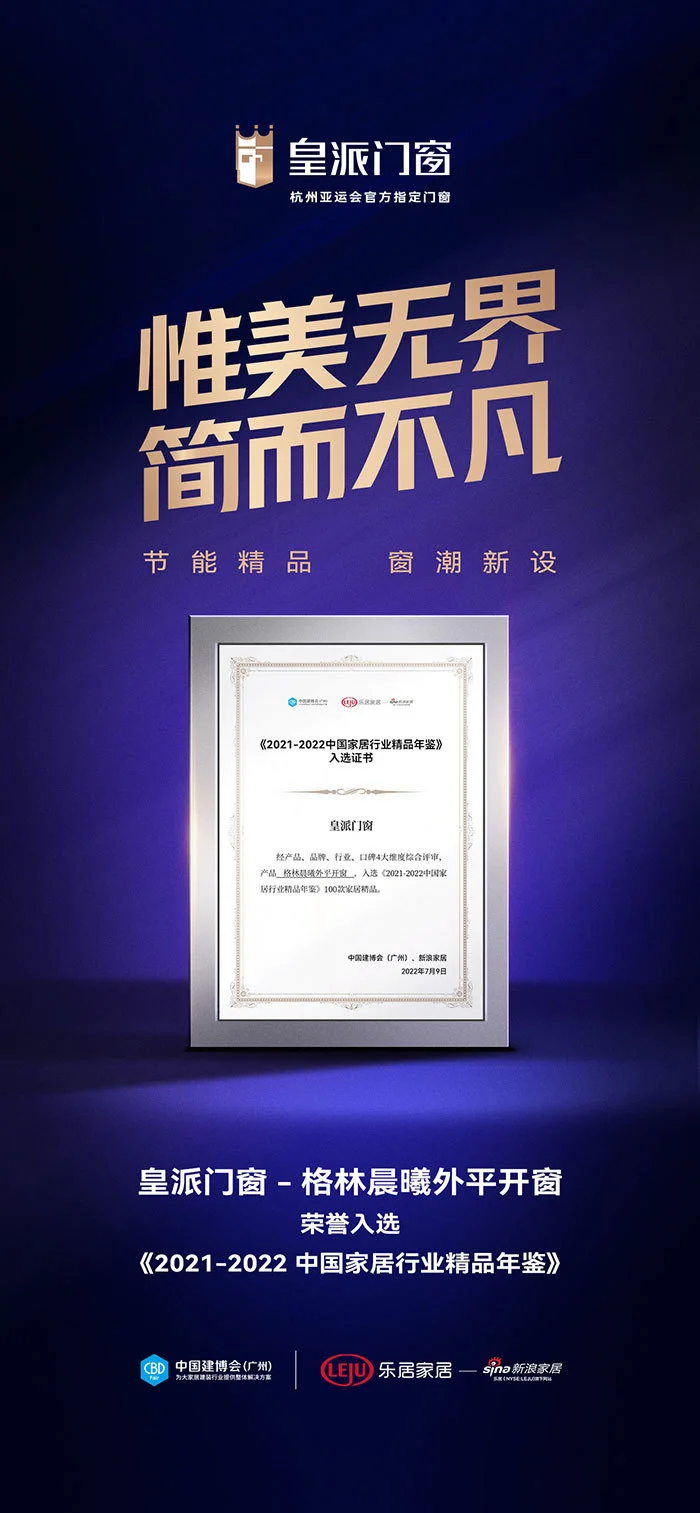 携手皇派门窗,共赢未来!在2022年的广州建博会上,杭州亚运会官方指定门窗皇派门窗,以“低碳迸进,共赢未来”为主题,充满亚运色彩的展馆和高颜值高性能门窗精品实力圈粉,现场客商云集,掀起签约热潮。值得一提的是,7月9日,皇派门窗产品实力再受肯定,格林晨曦系列荣誉入选《2021-2022中国家居行业精品年鉴》。
