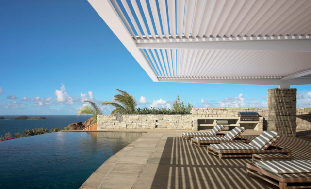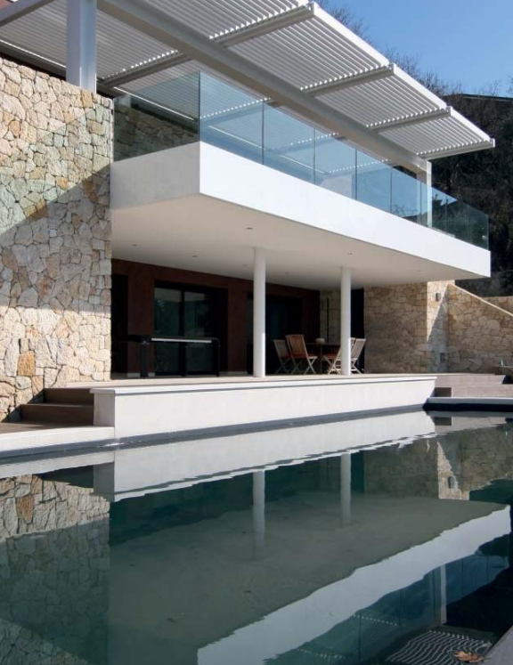 别墅的泳池边,大面积的户外生物气候遮阳篷下的空间足够放下沙发、躺椅或者茶几,而且还能给人十分气派的感觉。