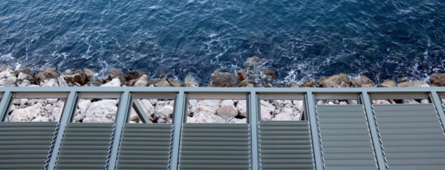 倾斜的遮阳铝片可以为山顶泳池创造自然通风的环境和宜人的幸福感,真正体会到那种面朝大海、春暖花开之感。