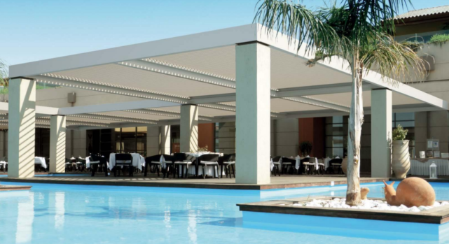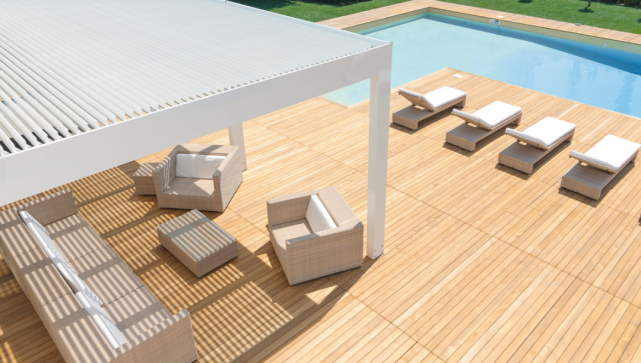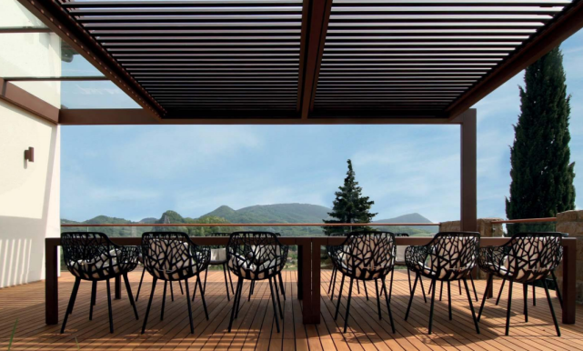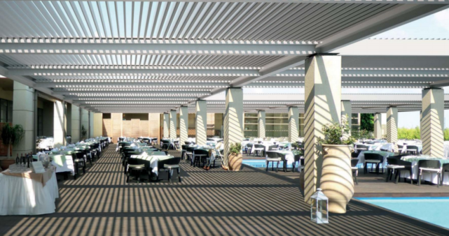 在露天泳池的周边,很多人都需要更大更宽阔的户外空间,这时候采用户外生物气候遮阳篷,可以通过一种极简的设计结构来满足此时的需求,也更易于组装。
